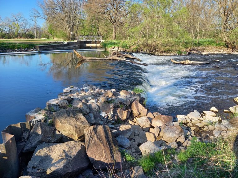 Es folgt das letzte Stück Richtung Schützenwehr. Auf der rechten Seite beginnt die Wehrkante, sichtbar durch Metall-Spundwände. Davor muss rechts ausgesetzt werden. Eine direkte Aussetzstelle gibt es hier nicht, es muss die flachste Stelle der Böschung gesucht werden. Es ist recht schlammig und nicht optimal zum Aussteigen. Zu zweit ging es ganz gut – allein braucht man auf jeden Fall etwas Geschick. Unsere Empfehlung ist, nicht direkt nach dem Schützenwehr wieder einzusetzen. Es folgt direkt das “gefährliche Wehr” Profen. Es gibt eine starke Sogwirkung, die vor allem für Packrafts und Leichtboote problematisch sein kann. Auch gibt es keine einfache, eindeutige Ausstiegsstelle. Auf der rechten Seite sollte daher etwa 500 m umtragen werden. Es ist ein offizieller Spazierweg – mit dem leichten Packraft also kein Problem. Das direkte Einsetzen hinter dem Wehr Profen ist möglich, jedoch lag bei unsrer Tour direkt danach ein Baum quer im Fluss, der nicht umfahrbar war. Wir setzten daher direkt nach dem Baum wieder ein – allerdings war diese Einsetzstelle deutlich steiler und schlammig.